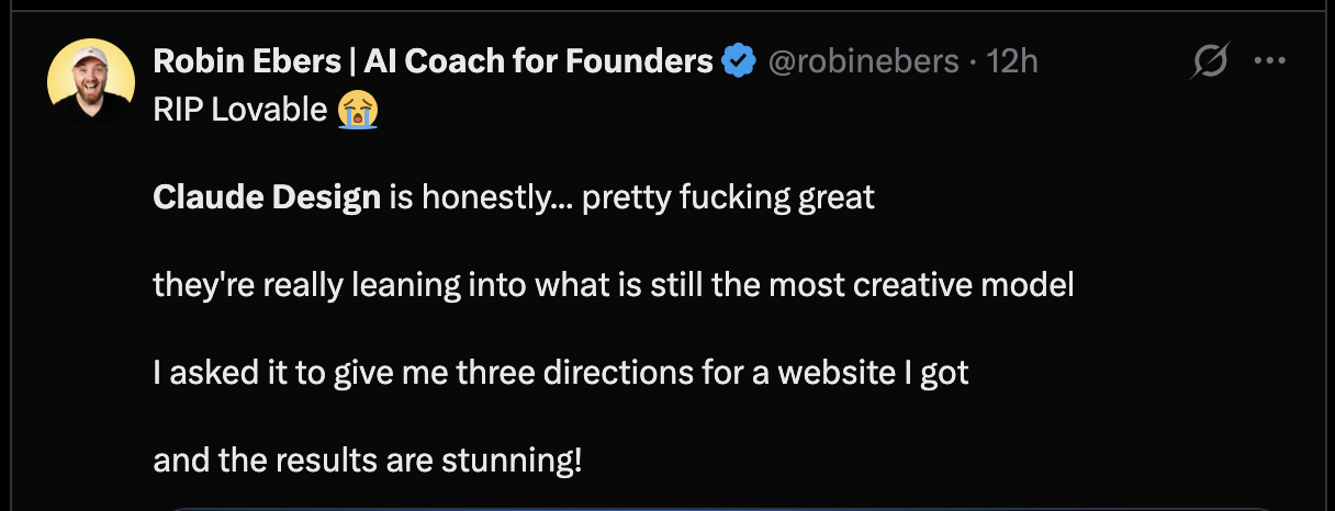 前阵子大家还在争论“Vibe Coding(氛围编程)到底有没有护城河”,当时很多人就不看好 Lovable 这类工具。这次拿它跟 Claude Design 一对比,一些用户认为更是坐实了这个观点: