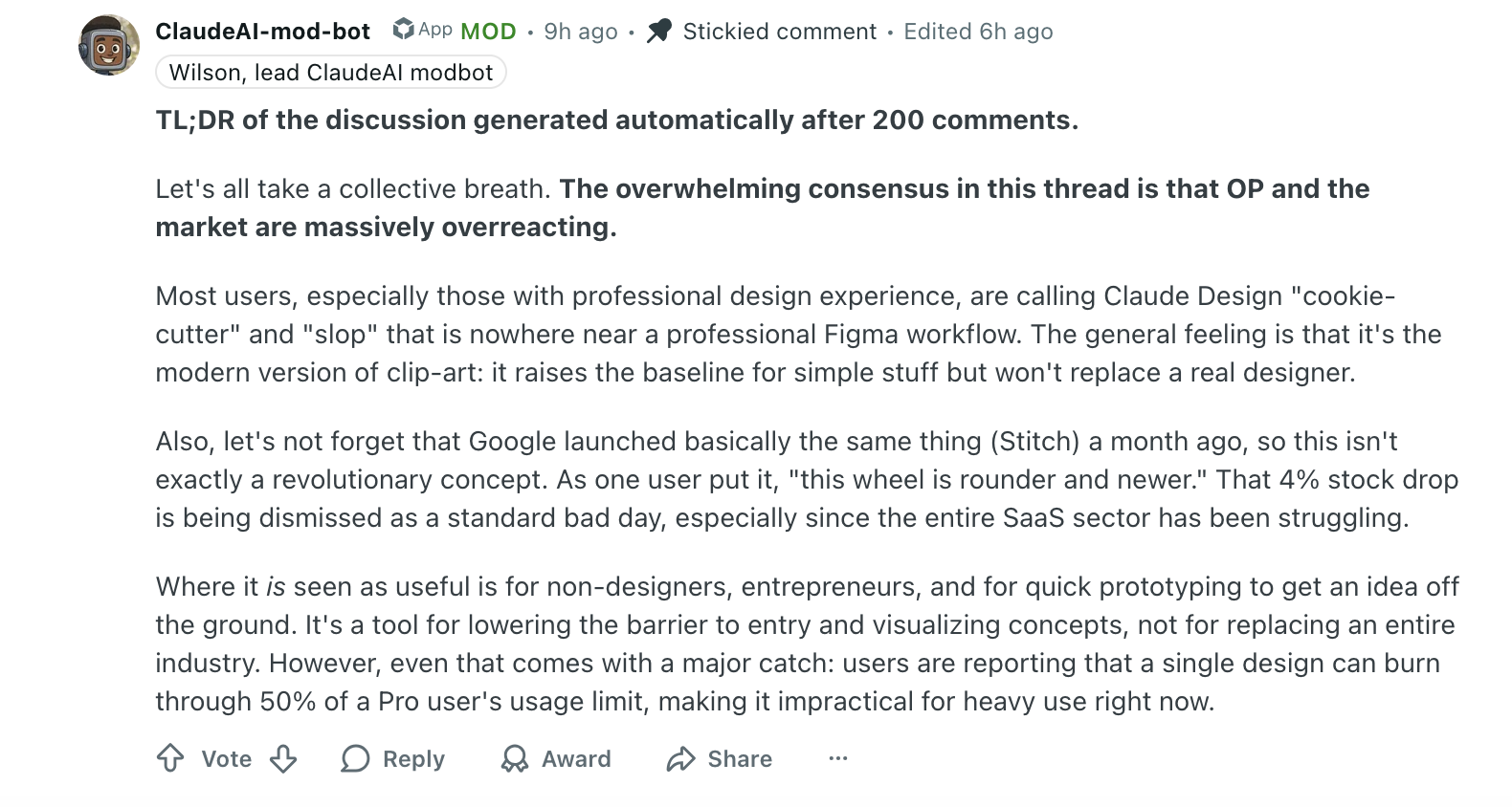 在 Reddit 等社区讨论中,不少具备专业设计经验的用户认为,Claude Design 生成的结果存在明显的同质化问题,整体质量更接近“现代剪贴画”——能够显著提升基础设计的下限,但距离高质量、差异化的专业设计仍有差距。因此,它更像是一个补充工具,而非替代方案。