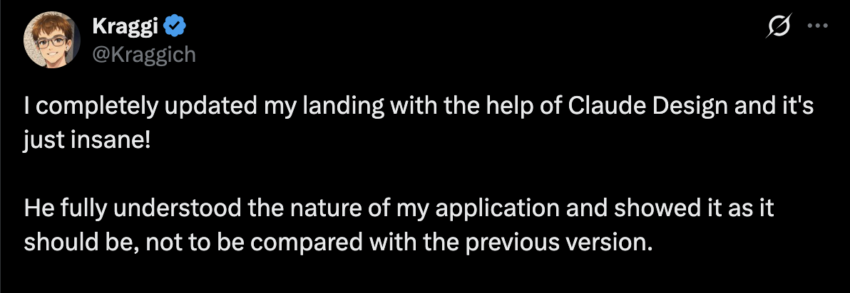 在这些 AI 系统中,该用户表示:“Claude Design 完全 get 到了我的应用的精髓,把它呈现出了应有的高级感——这一版简直是脱胎换骨,跟旧版根本不是一个量级的东西。”