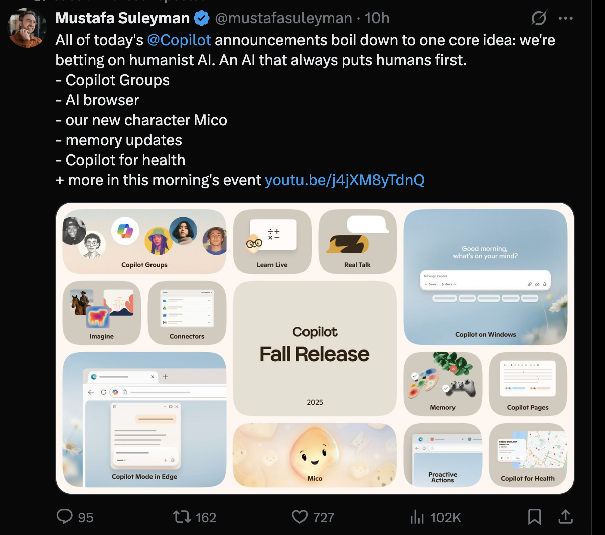 他在 X 发文称,“微软押注的是人本主义人工智能,一种始终以人为本的人工智能。”