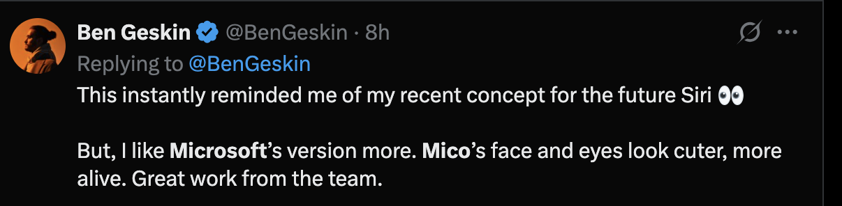 “这立刻让我想起了我最近对未来 Siri 的构想,不过,我更喜欢微软的版本。Mico 的脸和眼睛看起来更可爱,更有活力。团队做得太棒了。”