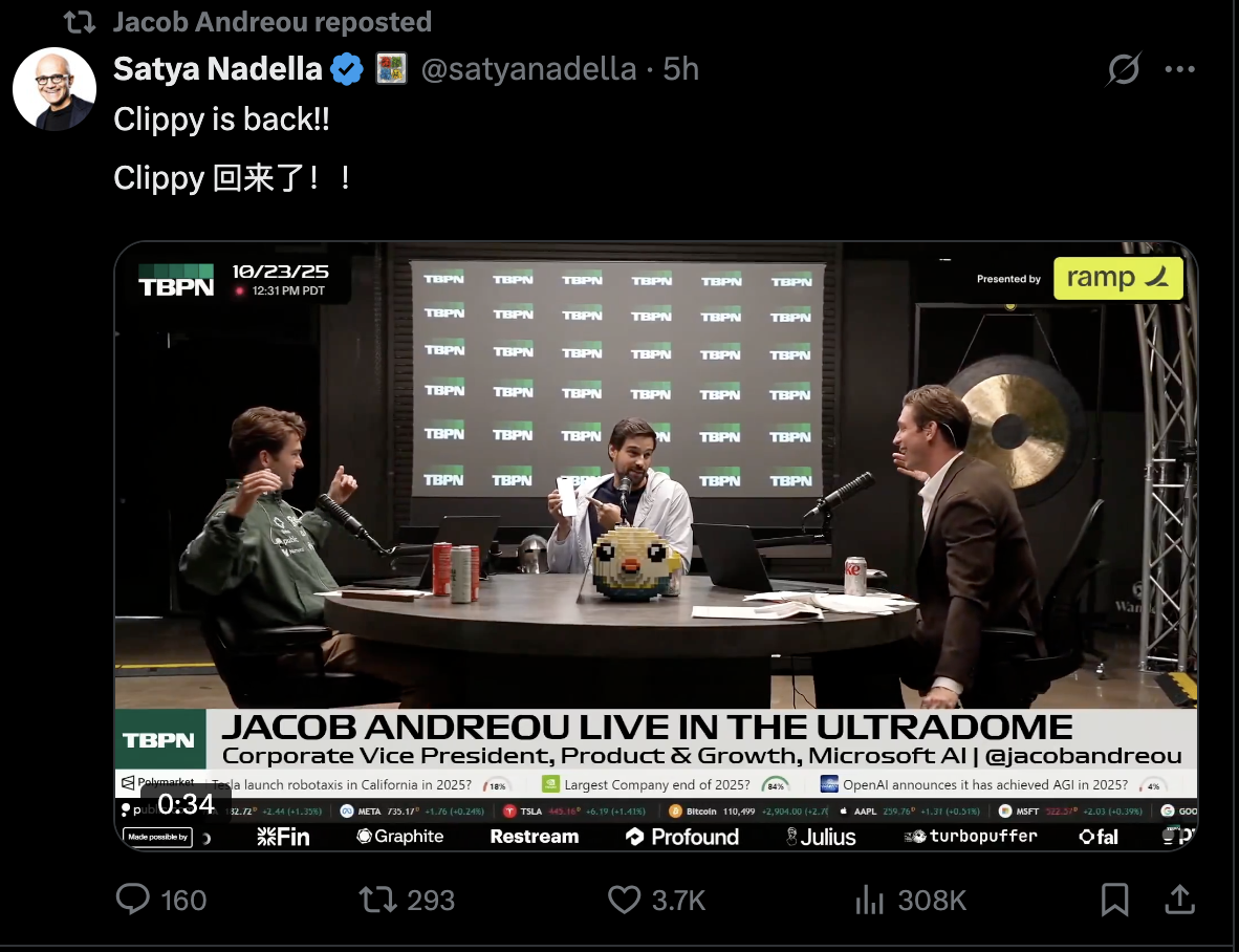 微软 CEO 纳德拉也在 X 上发文表示,“大眼夹回来了!”