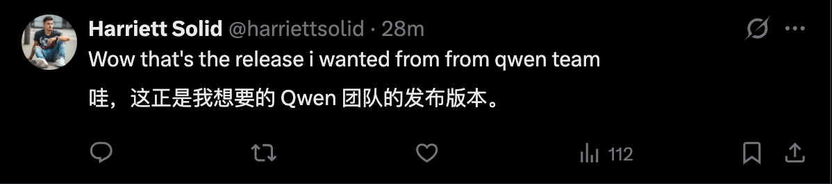 还有用户的反馈则更为直接。一位名为 Harriett Solid 的网友在评论中写道:“这正是我一直在等的 Qwen 发布版本。”这类评价并未展开具体技术细节,但从情绪上看,显然将 Qwen3-Max-Thinking 视为一次“到位”的升级,而不是过渡性产品。