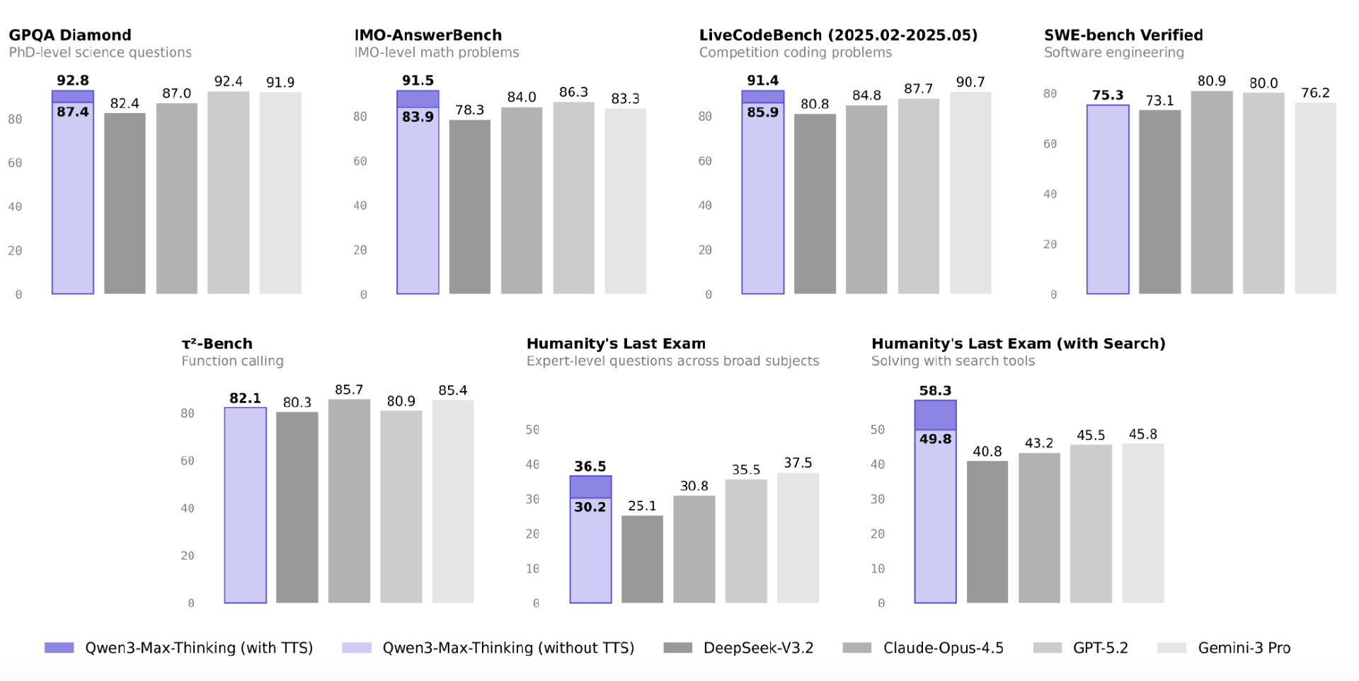 在多项权威基准测试中表现优异,Qwen3-Max-Thinking 性能可与 GPT-5.2-Thinking、Claude-Opus-4.5、Gemini-3 Pro 等闭源顶级模型竞争甚至超越。