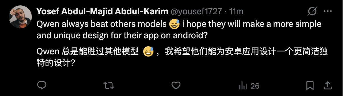 “Qwen 总是能跑赢其他模型,”一位用户调侃道,同时也提出了更偏产品层面的期待,希望 Qwen 能在 Android 端做出“更简洁、更有辨识度的应用设计”,认为模型能力已经走在前面,产品体验还有进一步打磨空间。