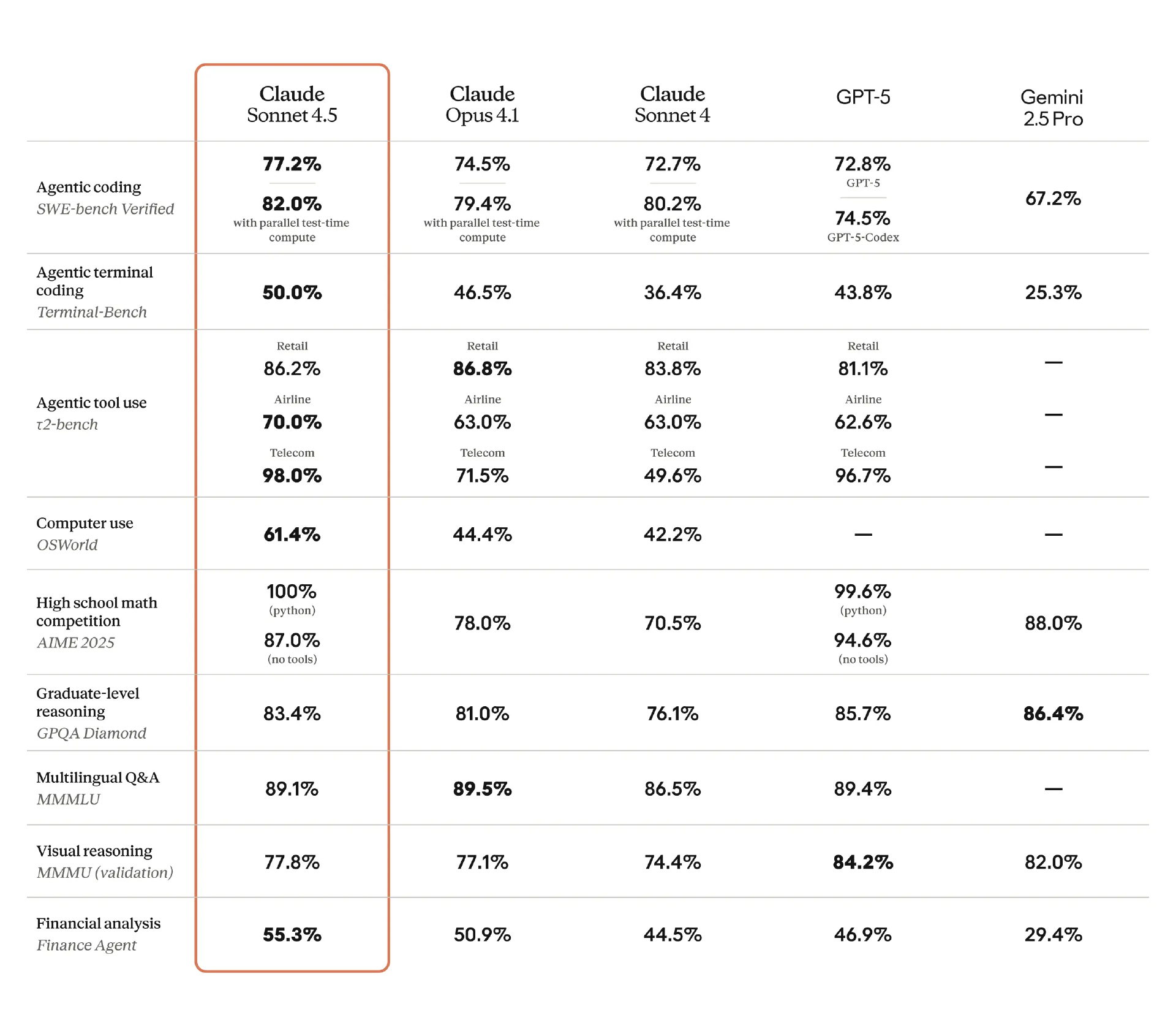 Claude Sonnet 4.5 延续了 Anthropic 一贯的策略——在持续提升模型性能的同时,保持对齐与安全性。该模型展示出能在超过 30 小时内持续进行复杂的多步推理与代码执行任务的能力。在衡量 AI 模型解决真实软件问题能力的 SWE-bench Verified 基准测试中,Claude Sonnet 4.5 的得分达到了 77.2%,相比 Sonnet 4 的 72.7% 有明显进步,标志着自主编程能力的又一次飞跃。而在评估实际计算机操作能力的 OSWorld 基准测试中,Sonnet 4.5 取得了 61.4% 的成绩,相比四个月前的 42.2% 有了显著提升。