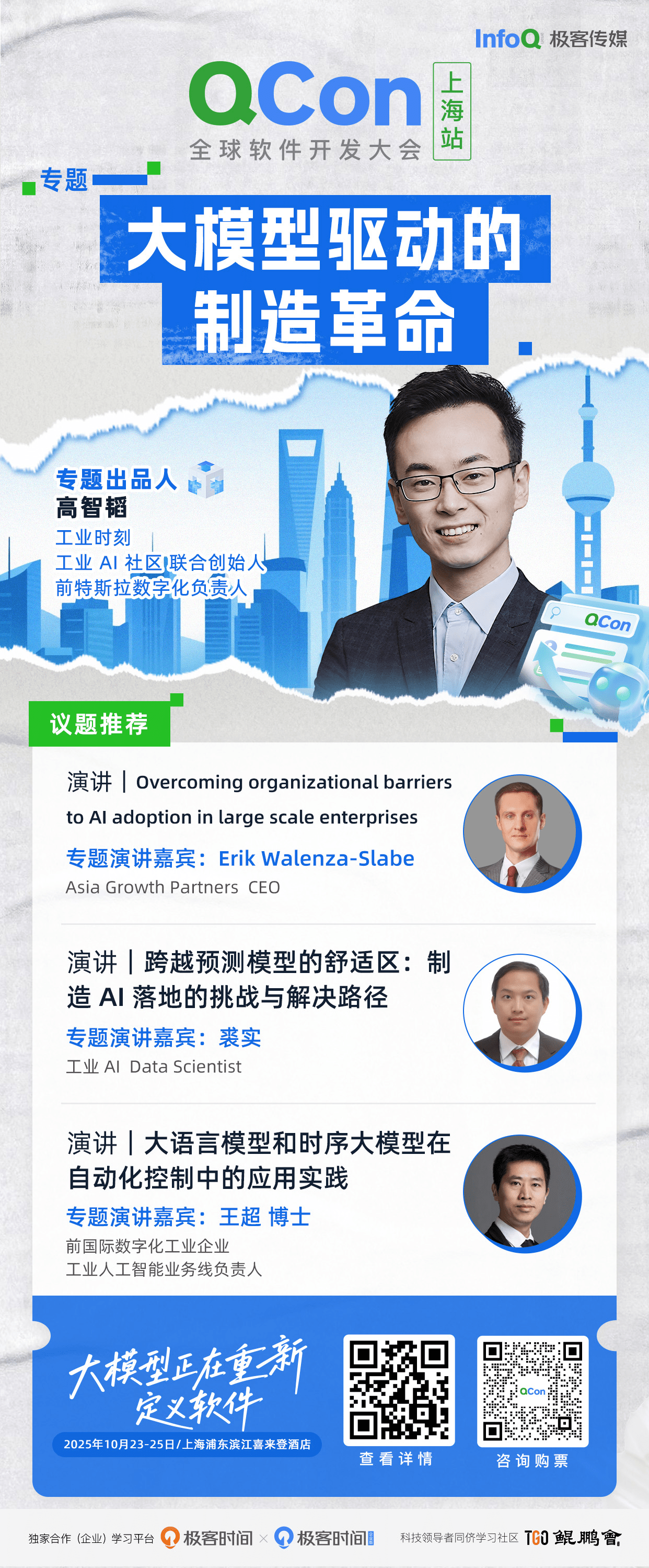 10 月 23 日-10 月 25 日,QCon全球软件开发大会将在上海举办。本次大会将聚焦 Agentic AI、具身智能、强化学习框架、端侧大模型实践、多智能体协作等热门话题,以及 AI 时代下的软件研发、可观测、开源等技术实践,邀请来自腾讯、阿里、字节跳动、华为、蚂蚁集团、小红书等企业的技术专家,和来自清华大学、北京邮电大学、浙江大学的顶尖高校讲师,和你一起重构技术认知与能力边界!
