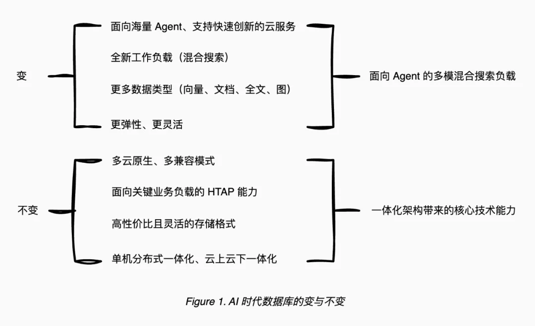 AI 时代带来技术平权,从数据库使用方式来看,主要带来两点变化:一是每个普通用户通过 AI Agent 使用数据库,带来海量多租户需求;二是新增了全新的多模混合搜索工作负载。同时,原先的 OLTP、OLAP 以及 HTAP 的需求仍然存在。