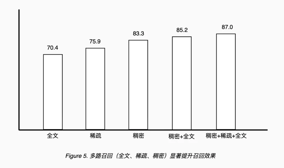 相比单一路径的向量搜索,混合搜索能够大幅提高召回效果。实验和实践表明,如果只采用单一路径搜索——无论是全文、稀疏还是稠密向量,都难以达到最优结果;只有将全文、稀疏和稠密向量结合起来执行混合搜索,才能最大化召回效果。理论上,只要重排序(rerank)算法足够出色,搜索方式越多,效果越好。当然,实际生产系统中往往是搜索效果和执行效率的一个平衡。一般来讲,向量和全文的混合搜索就能达到不错的效果,少部分场景会引入知识图谱来获取全局信息。知识图谱的难点并不在算法本身,而在于很难自动构建一个准确率比较高的知识图谱,因此,往往应用在一些特定领域,比如用于表示医疗、法律等行业的特定术语和这些术语之间的关联关系。