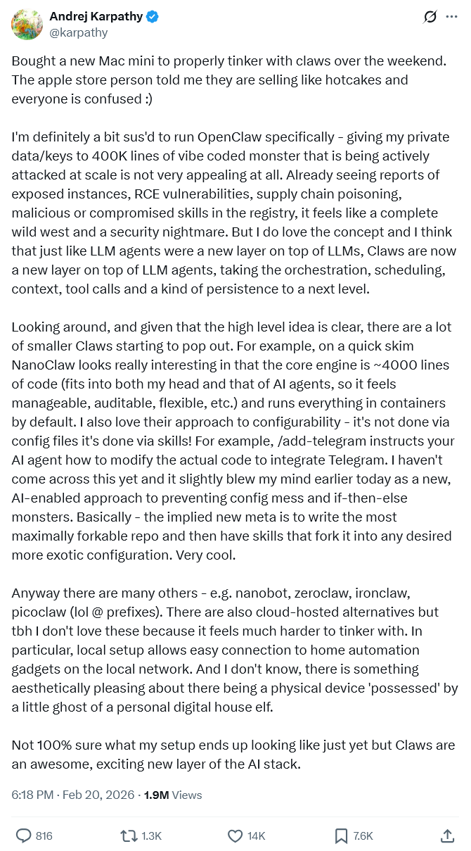Karpathy 原帖:htps://x.com/karpathy/status/2024987174077432126