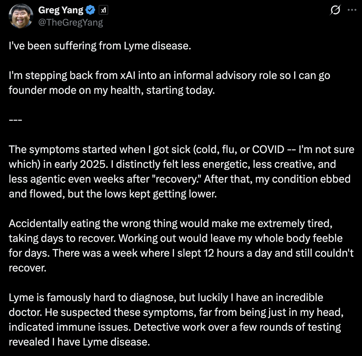 杨在 x 上发文表示,他可能在一段时间前感染了莱姆病,症状是在 xAI 高强度工作期间变得明显的。
