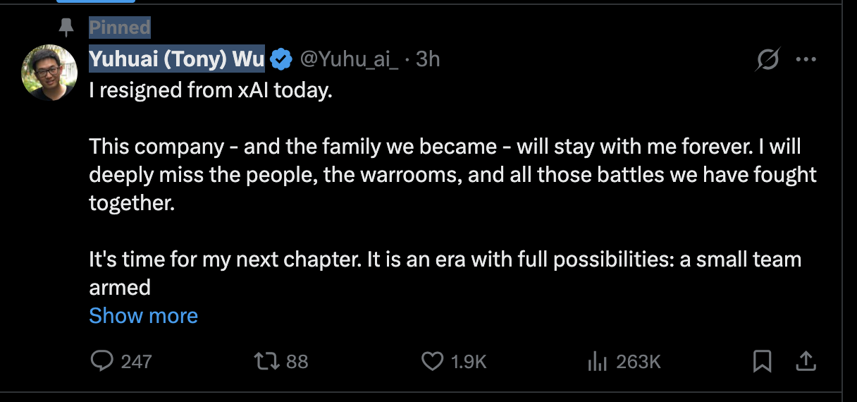 几个小时前,全球首富马斯克旗下人工智能公司 xAI 再迎联合创始团队成员离职。xAI 公司联合创始人 Yuhuai (Tony) Wu(音译:吴玉怀)在 x 上发文称,今天正式从 xAI 辞职了。他写道: