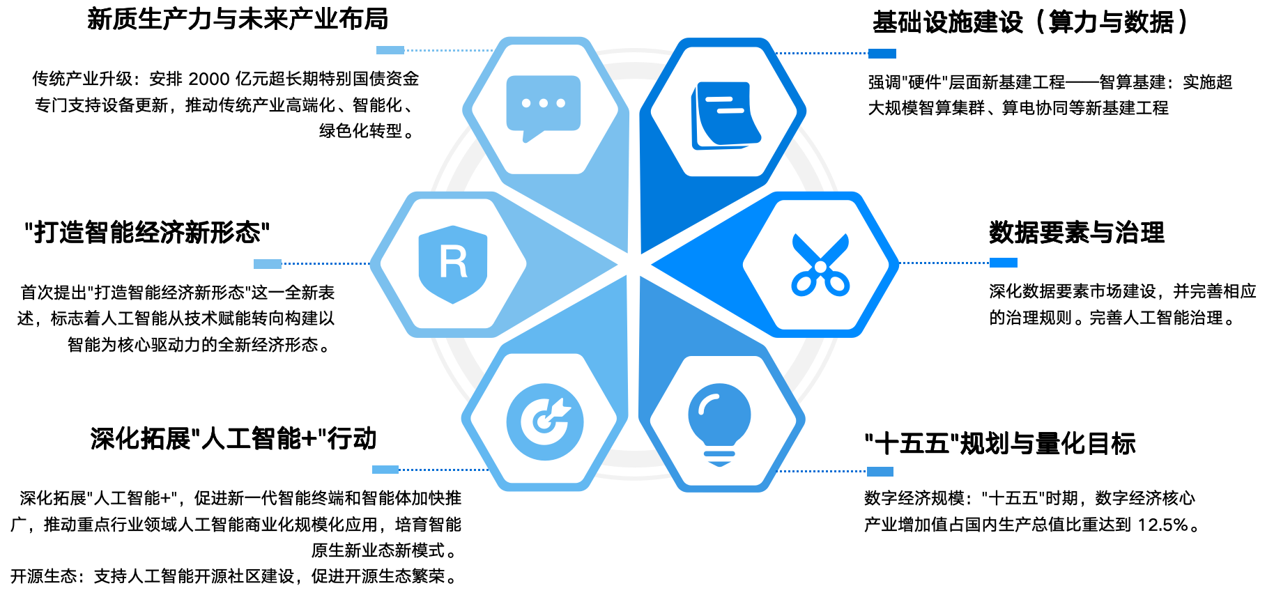算力先行:首次提出“实施超大规模智算集群、算电协同等新基建工程”,解决 AI 发展的能源与算力瓶颈。