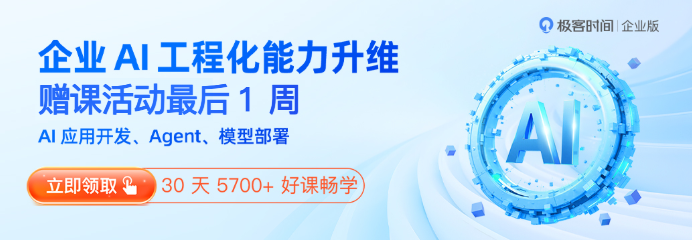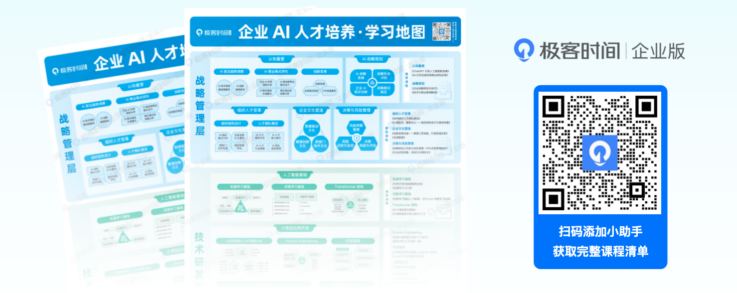 极客时间愿与万千企业同行,将国家指明的“AI 发展蓝图”,转化为组织内部实实在在的“AI 人才红利”。如果您也希望加速企业的智能化人才梯队建设,欢迎联系我们,获取专属的 AI 人才培养方案。