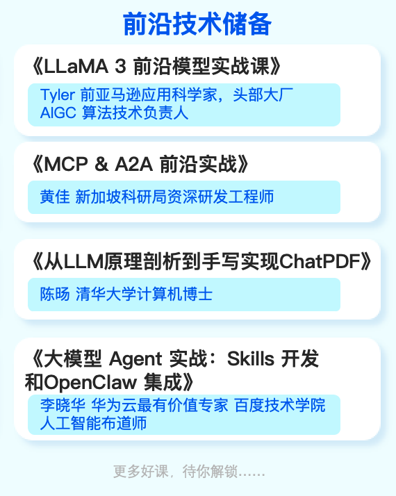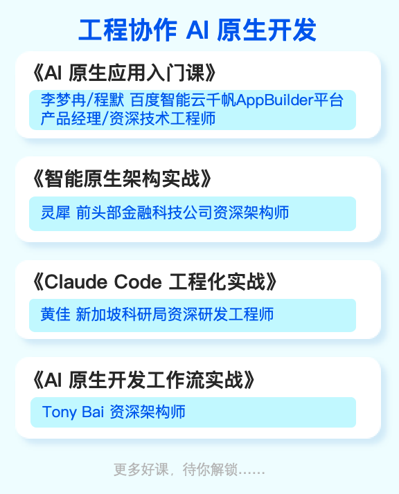 报告强调“加快推广智能体”,这对技术团队的工程化能力提出了极高要求。极客时间提供了从基础到前沿的完整路径: