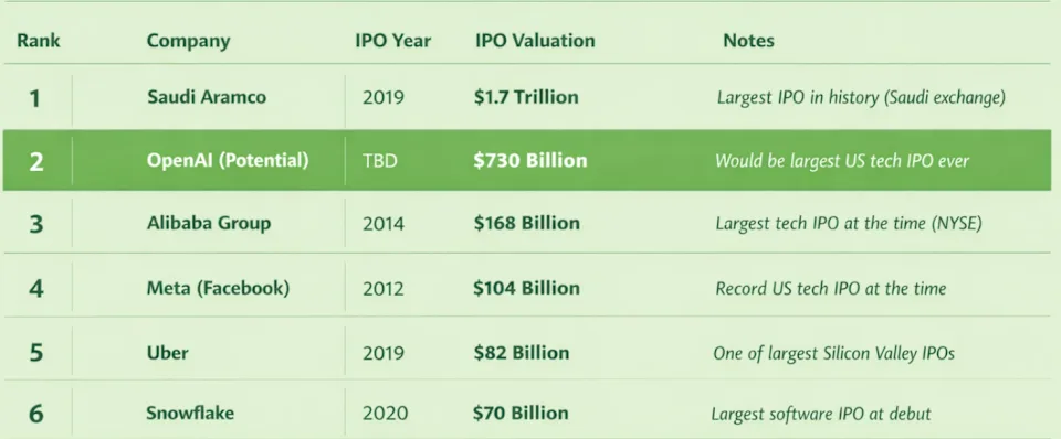 在全球范围内,沙特阿美(Saudi Aramco) 仍保持着 IPO 规模纪录,上市时估值约 1.7 万亿美元。而在 7300 亿美元的估值水平上,OpenAI 已经进入了一个完全不同的体量级别,也反映出投资者对前沿 AI 的巨大信心。