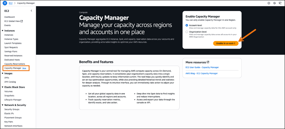 最后,Amazon EC2 容量管理器在所有商业 AWS 区域中默认启用,并且不额外收取任何费用。