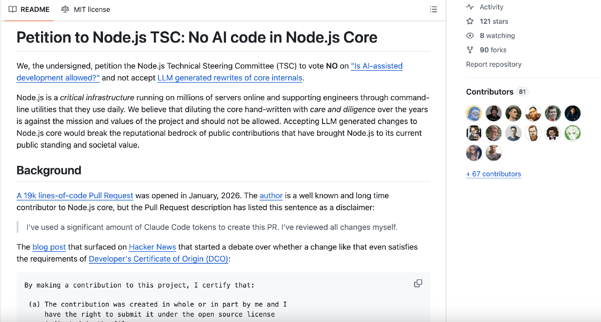 Fedor Indutny 的担忧不在于代码质量,而在于 AI 辅助的代码是否符合 DCO 1.1 条款(每位 Node.js 贡献者在提交 PR 时必须签署的法律证明)。他甚至发起了一份请愿书,要求 Node.js 技术指导委员会(TSC)投票禁止在核心项目中使用 AI 辅助开发。