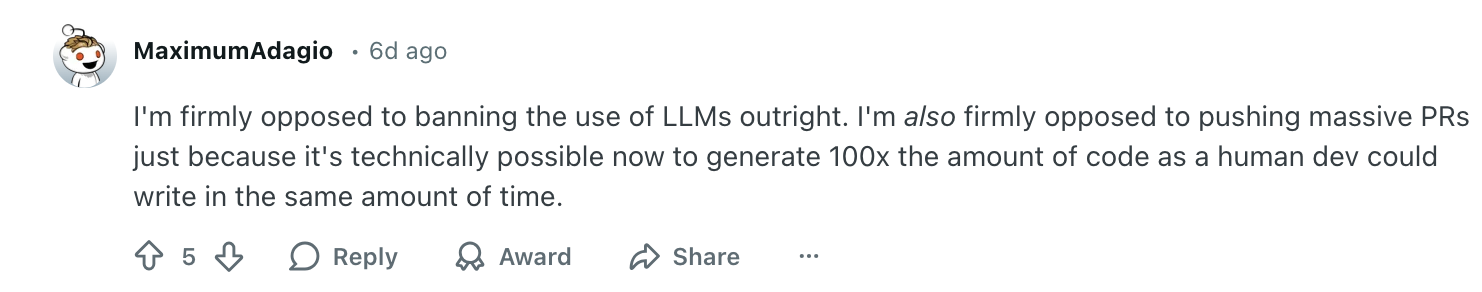 也有用户辩证地去看待这件事,他表示:“我坚决反对‘一刀切’地禁止大模型,但我也同样反对那些仅仅因为 AI 提速了,就毫无节制地提交巨量代码的行为。不能因为现在能比以前快 100 倍,就理所当然地往社区塞入 100 倍规模的 PR。”
