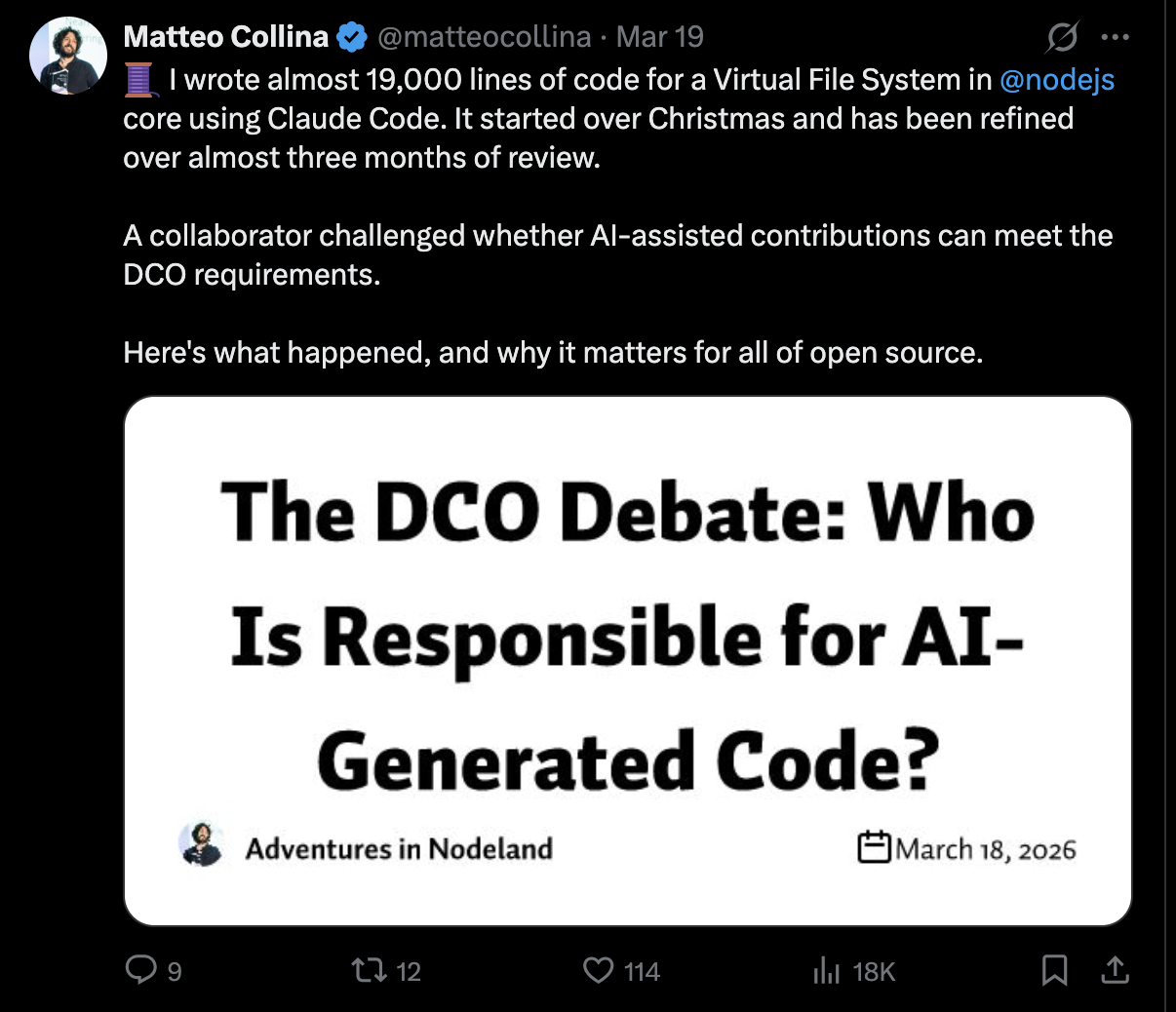 这三个独立组织——DCO 的创造者、世界最大的开源法律团队之一、Node.js 自己的基金会——都达成了相同的答案:AI 并不破坏 DCO。重要的是问责制。