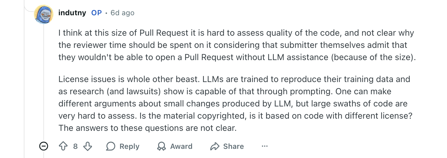 “我选择了架构。我根据所有审查者的反馈塑造了 API。我做出了设计决策,捕捉并修复了 AI 引入的问题,我理解代码每一部分的作用和原因。我签署了 DCO。我的名字在上面。如果有 bug,是我的责任。如果有许可问题,是我认证了合规性。”