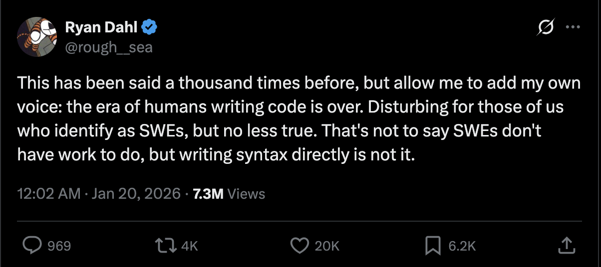 https://www.reddit.com/r/node/comments/1qhulv1/creator_of_nodejs_says_humans_writing_code_is_over/