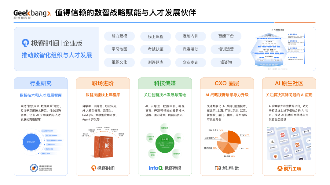 当 AI 重构千行百业,企业对“懂技术、会落地、能创新”的数智人才需求,已从“可选”变为“刚需”。极客时间企业版始终致力于将前沿数智技术与实战知识体系深度融合,此次入围正是对公司在应对时代命题、推动产业人才升级方面能力的高度认可。