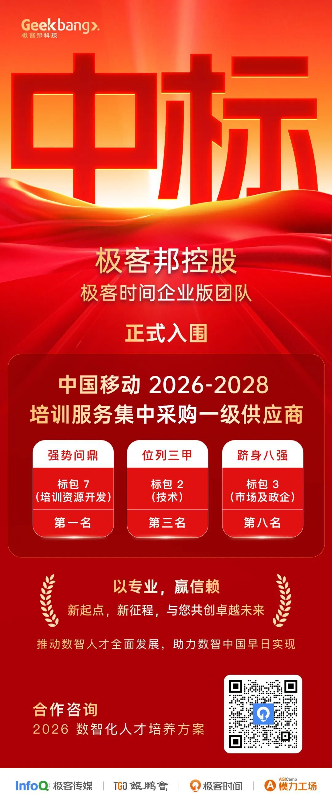 极客时间企业版(极客邦控股(北京)有限公司)成功入围中国移动 2026–2028 年培训服务集采项目,正式成为其一级供应商。在技术、市场及政企、培训资源开发三大标段中均取得优异成绩,彰显了公司在 IT 与数智化培训领域的深厚实力和生态优势。