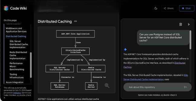 Code Wiki 还提供了一个聊天用户界面,用于咨询与代码库相关的问题。我们曾询问,是否能用 Postgres 替代 SQL Server 作为 ASP.NET Core 的分布式缓存。Gemini 表示,“目前没有地方提及对 PostgreSQL 的直接支持或开箱即用的实现方案”。