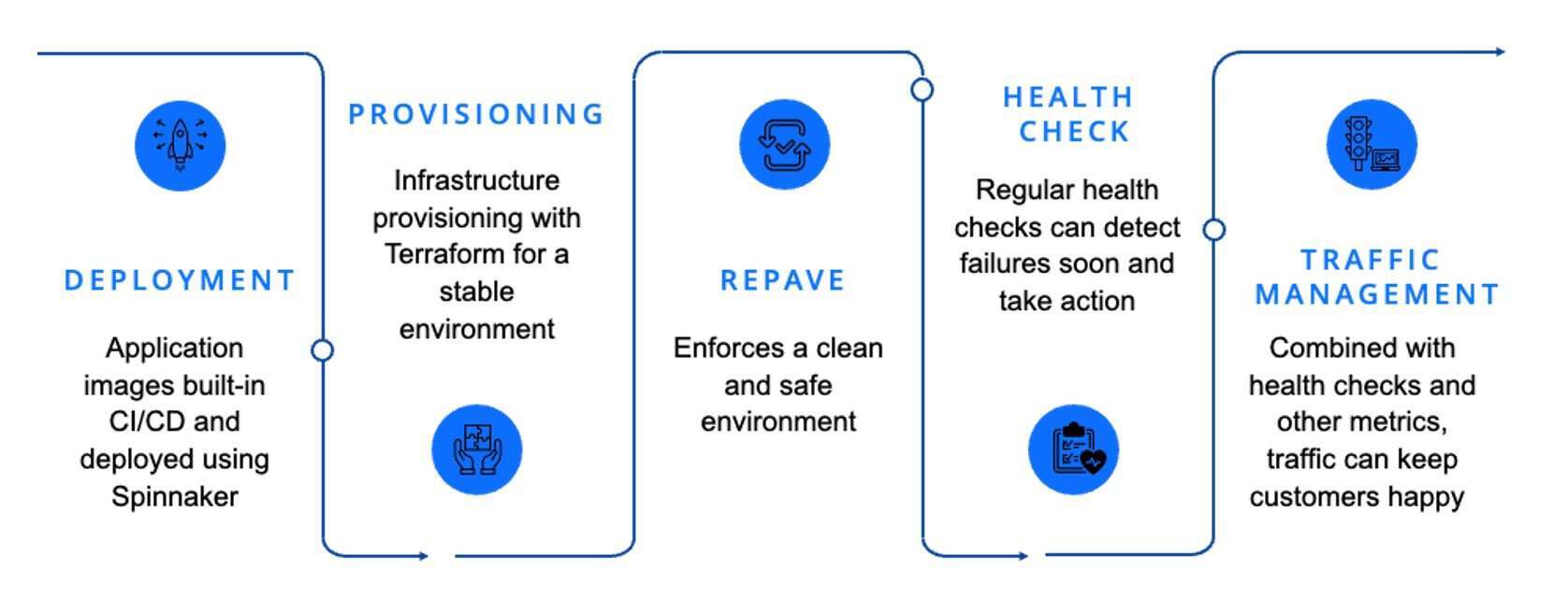 自动化是关键的战略元素。在整个流水线的各个阶段实施全面自动化可带来巨大收益,这需要涵盖部署、基础设施供应、环境配置、集成自动化操作的健康检查,以及整体的流量管理。