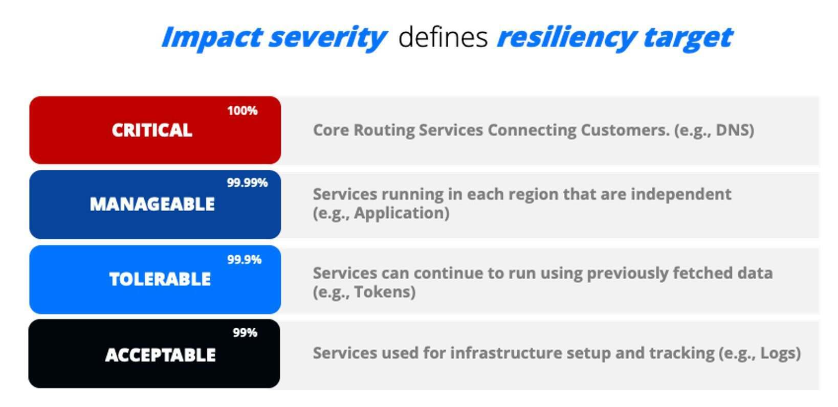 最后,可接受(Acceptable)层的组件允许有限的数据丢失,比如,某些日志系统。韧性目标由影响的严重程度决定。