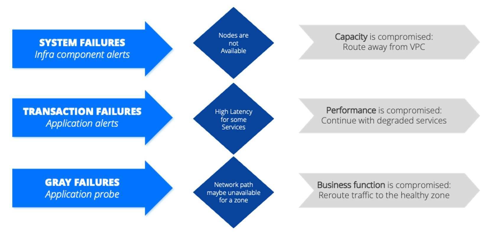我们可能会遇到如下的场景,告警指示节点不可用且容量受损,这可能是供应商的问题,流量需要从受影响的 VPC 进行重定向;应用告警显示延迟问题且性能受损,组织需要根据业务需求决定是继续提供降级服务,还是满足服务等级协议(service level agreement,SLA)的要求。在这样的场景中,选择降级服务意味着接受较慢的性能,而非切换至可能存在相同问题的其他可用区。