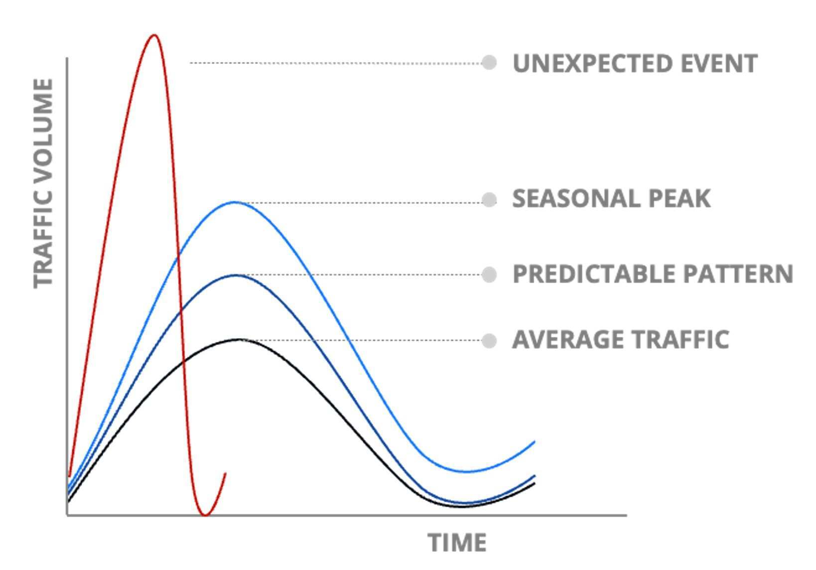 在规划的时候,人们通常只会考虑两到三倍的负载增长。然而,一旦系统部署在互联网上,就无法控制入站流量的规模、时间或使用模式。任何事件(无论是源于合法业务增长,还是恶意攻击者的行为)都可能引发巨大的负载激增。这两种情形各自会带来截然不同的挑战。
