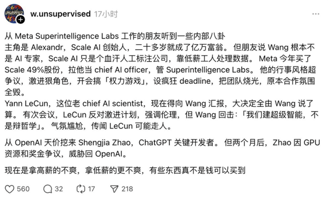 另外有人爆料称,在一次内部会议上,LeCun 向大家强调长期研究的重要性,一个年轻人直接呛道:““我们是在开发超级智能,不是在辩论哲学。”