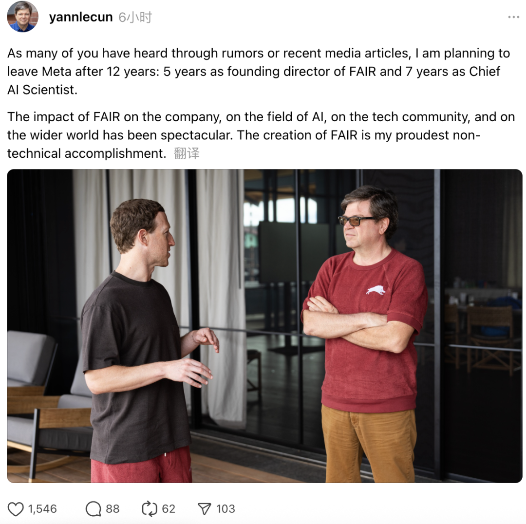 刚刚,图灵奖得主、深度学习三巨头之一的 Yann LeCun,亲自在 Threads、领英等多平台宣布,年底从 Meta 离职,并投身创业。