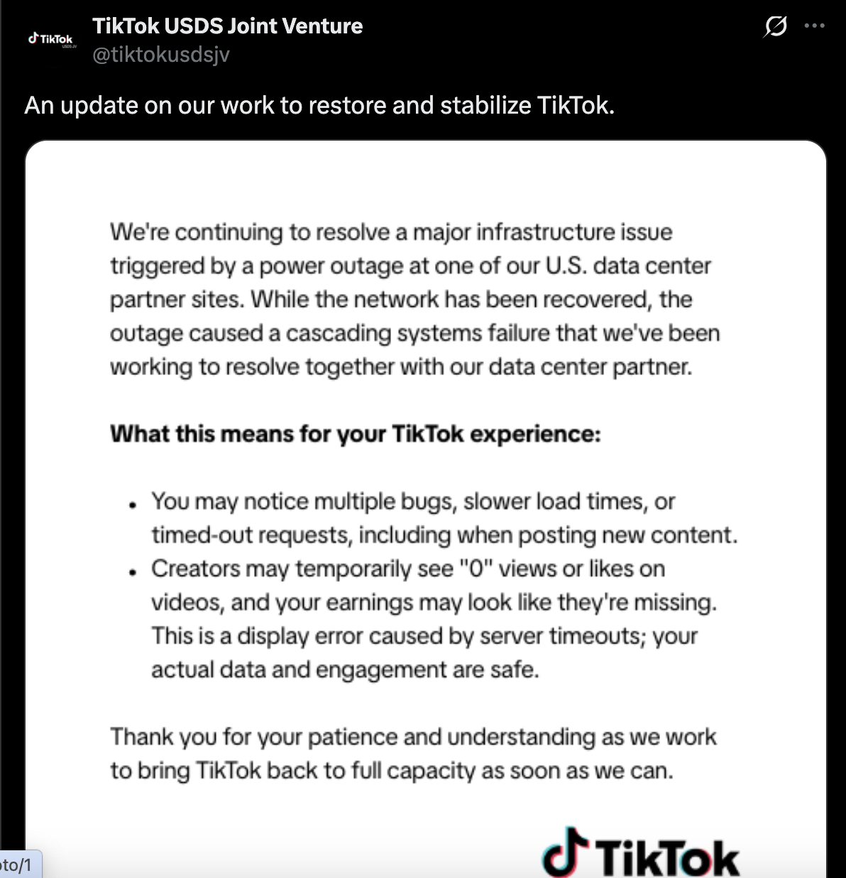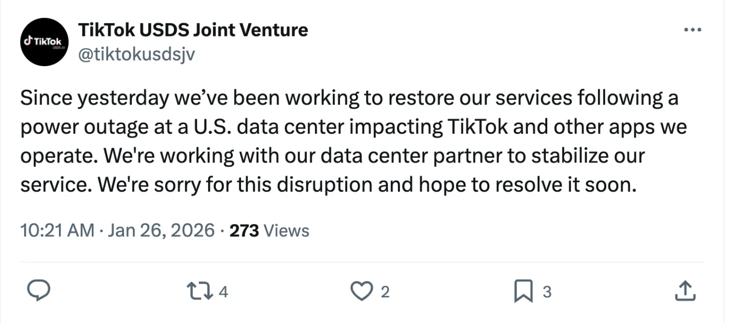 TikTok USDS 发言人 Jamie Favazza 在给 The Verge 的一封电子邮件中指出,该公司在其新创建的 X 账户上发布了一份声明,声明称,由于美国数据中心发生电力中断,影响了 TikTok 和我们运营的其他应用程序,公司一直在“努力恢复服务”。