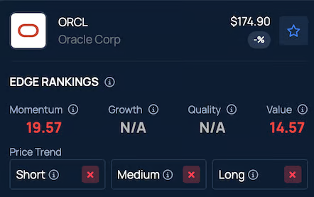 据 Benzinga Pro 报道,Oracle 公司股票在事件曝光当日收于 174.90 美元,下跌 4.13%,但在盘后交易中回升 1.16% 至 176.93 美元。Benzinga 的 Edge 股票排名显示,Oracle 股票在动量和价值维度上的评分均处于较低水平,反映出其在短期至长期内的价格趋势承压。