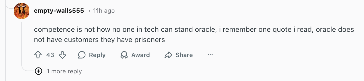 他还引用了一句在技术圈流传已久的说法:“Oracle 没有客户,只有囚犯。”这类评论并未直接指向此次事件的具体责任,但反映出 Oracle 在开发者与工程师群体中的长期口碑问题。