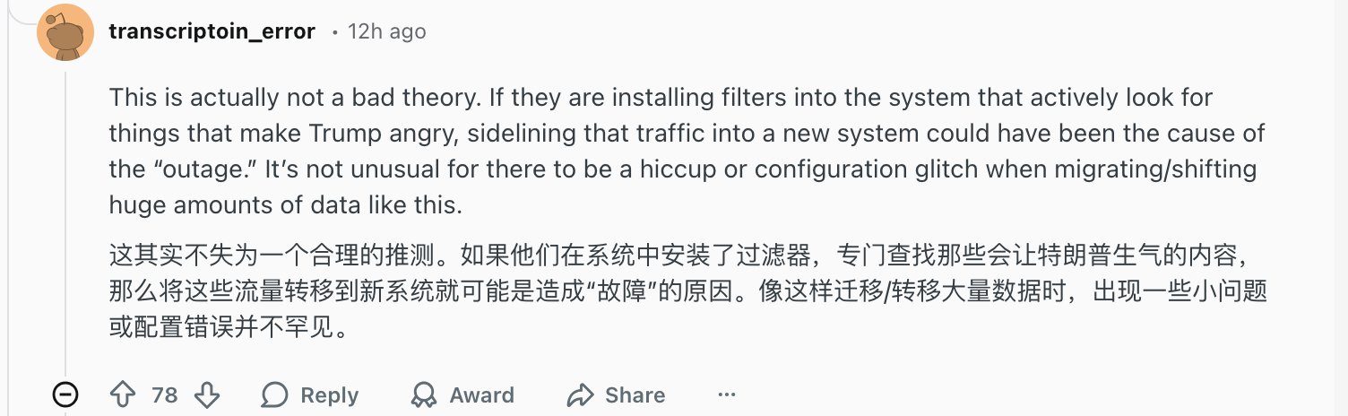 他认为,如果平台在系统中新增了内容过滤机制,那么在将相关流量迁移到新系统的过程中,确实有可能引发故障。他指出,在大规模系统迁移或数据转移时,出现配置错误或小规模失效并不罕见,尤其是在新旧系统并行、过滤规则叠加的情况下。