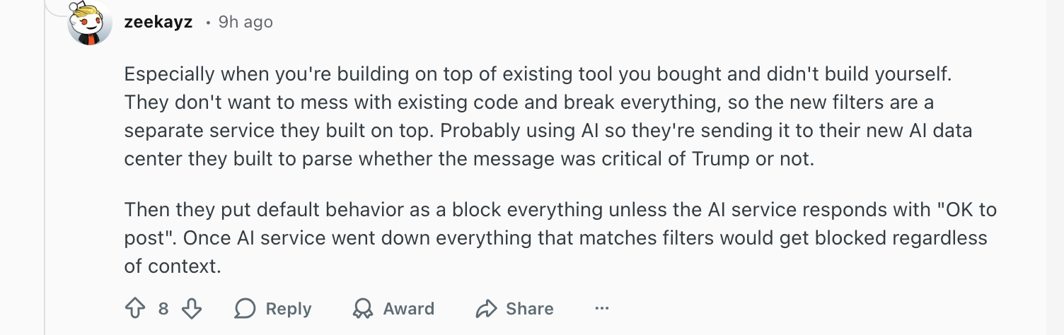 该用户进一步推测,如果这一 AI 服务发生宕机,而系统默认策略又是“未通过即阻止”,那么大量内容就可能被一并拦截,从而在用户侧表现为算法行为的“剧烈变化”。