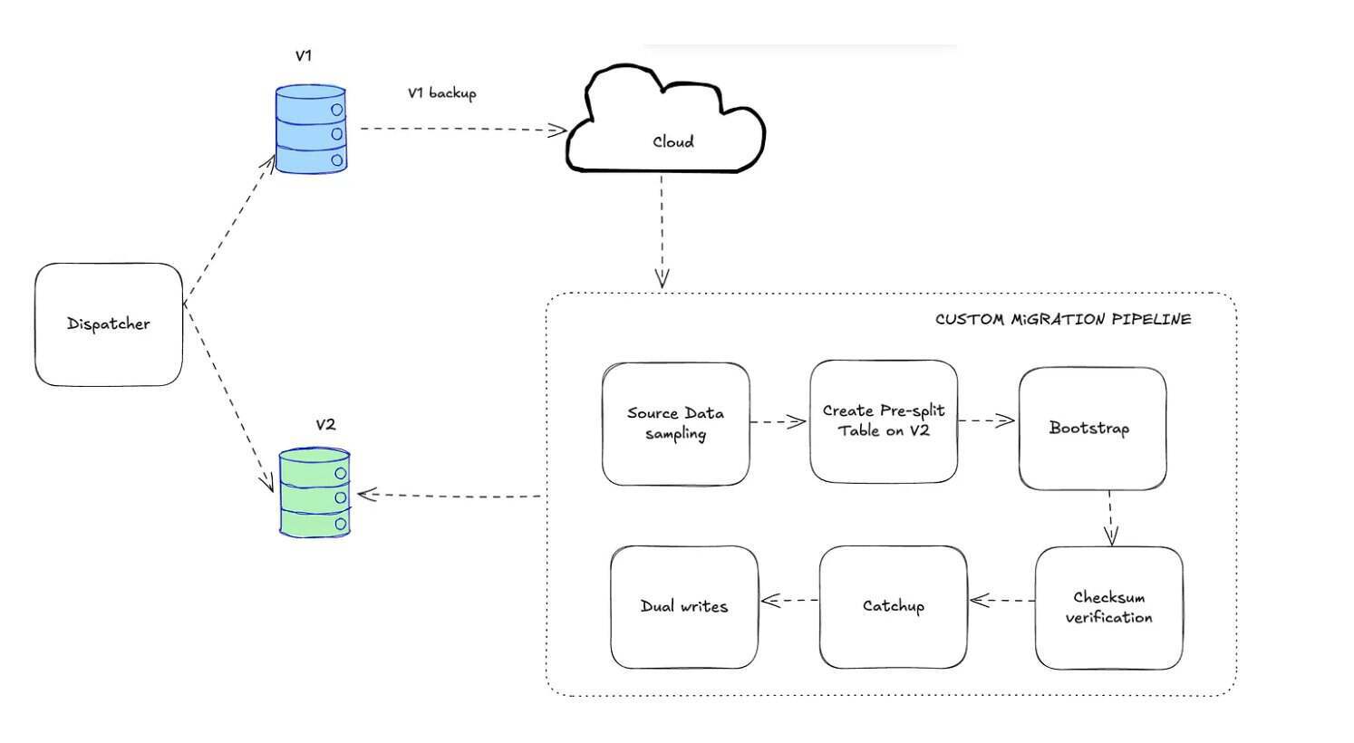 根据 Airbnb 的工程团队的说法,从 v1 迁移到 v2 带来了重大挑战。团队使用了具有表级别粒度的蓝绿方法、持续验证和回退机制。由于 v1 缺乏原生变更数据捕获或表快照,表通过备份和抽样数据引导到 v2 以计划预分割。在引导摄取和验证校验和之后,再应用滞后的 Kafka 事件,并启用双重写入。在切换过程中,读取逐渐转移到 v2,而影子流量监控一致性,如果错误率激增则回退到 v1。Kafka 在整个迁移过程中充当公共日志。