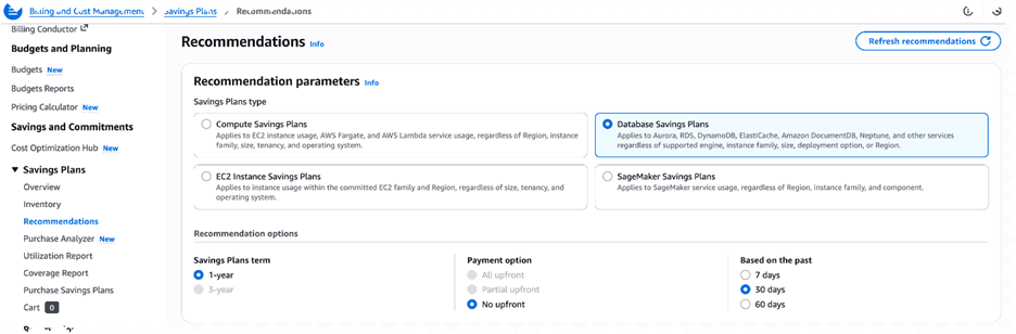 亚马逊云科技计费和成本管理控制台可以帮助客户选择和购买节省计划。他们可以从亚马逊云科技管理控制台、AWS CLI 或 API 开始,数据库节省计划可以在推荐视图或购买分析器中进行评估。