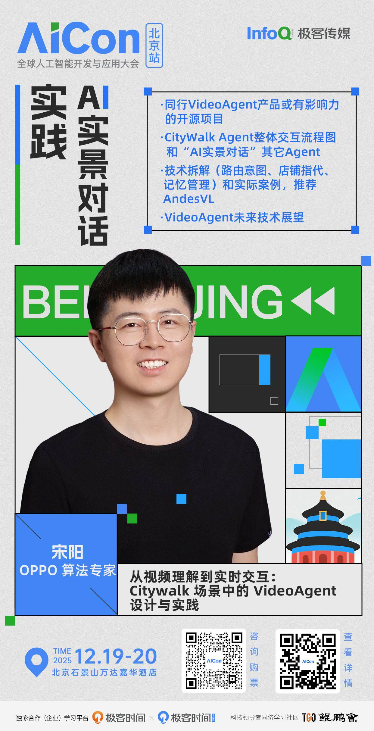 OPPO 算法专家宋阳已确认出席并将在「多模态从技术突破到创新应用落地」专题发表题为《从视频理解到实时交互:Citywalk 场景中的 VideoAgent 设计与实践》的主题分享。OPPO 在 2025 年开发者大会上发布了“AI 实景对话”首次让助手“走出屏幕”。在线下门店场景中,他们与大众点评达成深度合作,支持用户在逛街时(CityWalk),通过实景对话功能调用手机中大众点评的店铺信息与菜单数据,完成类似“AI 版探店助手”的体验。即使站在餐厅门口,也无需手动搜索,AI 即可提供评价、推荐菜品与价格信息。
