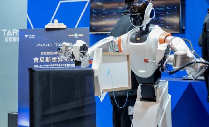 硬件方面,它石智航已推出了轮式工业机器人 A 系列和双足通用机器人 T 系列。其中,A 系列机器人可实现亚毫米级精度的装配操作。以线束装配为例,这是工业场景中典型的高难度精密操作任务,广泛应用于汽车制造、3C 电子等领域。因为自动化难度极高,线束装配还被称作是工业自动化界的“哥德巴赫猜想”。今年 3 月,A1 机器人在 1 小时内完成亚毫米级柔性线束完整装配任务百余次,创下全新吉尼斯世界纪录,这也是中国具身智能企业在工业精密操作领域的首个吉尼斯世界纪录。