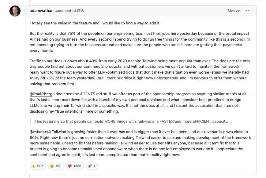 “我认为,AI 是我们业务陷入困境的重要原因之一——即便它也让 Tailwind 变得比以往任何时候都更受欢迎。但同时,我也觉得 AI 是一项了不起的技术,我对它感到兴奋,也在思考它如何帮助我、帮助我们。在目前这个阶段,我们可能被迫要更认真地思考,如何利用 AI 来覆盖我们需要处理的所有事情。”