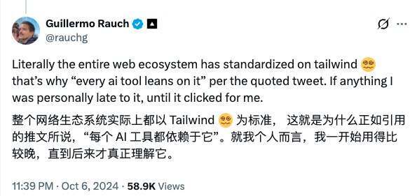 正如Vercel CEO Guillermo Rauch所说:“整个 Web 生态正在向 Tailwind 标准化,所以每个 AI 工具都在用它。”