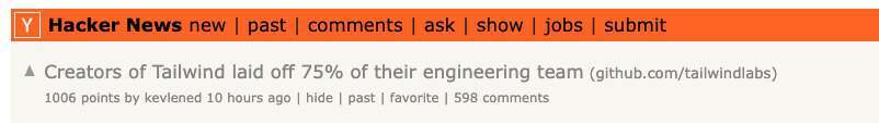 HN 首页一条帖子标题很直接:“Tailwind 的创作者裁掉了 75% 的工程团队”,链接指向 TailwindLabs 的 GitHub 讨论。发出约 10 小时后,评论也堆到 598 条,迅速变成当天的高热讨论。