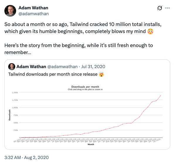 2020 年 7 月,Adam Wathan 还在公开回顾 Tailwind 的“上升期叙事”:Tailwind 的累计安装量刚刚突破 1000 万,而他们的首个商业化产品 Tailwind UI 上线仅约 5 个月,收入就即将跨过 200 万美元。他把这段经历形容为“完全超出想象”,并特意把最初发布在 Twitter 的长帖重新整理成文章。