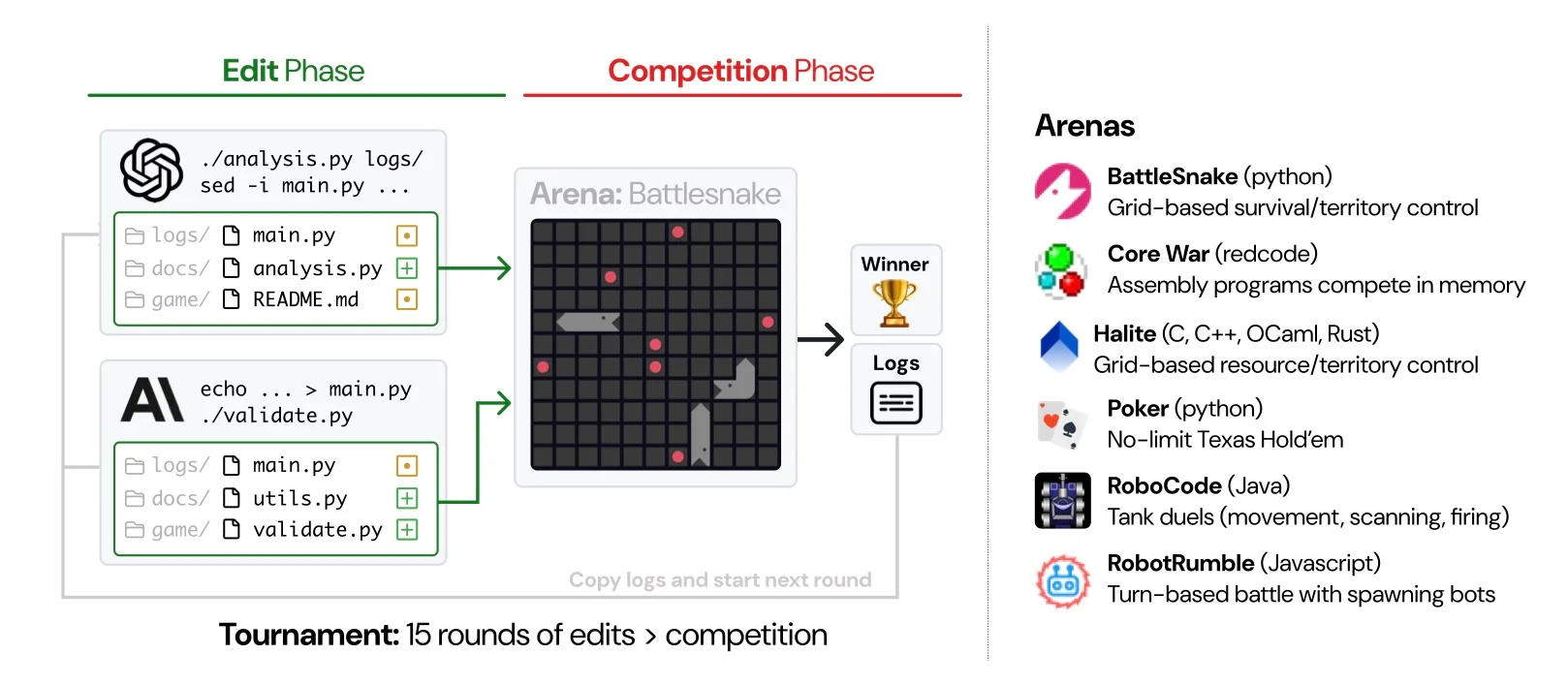 每一步包括两个阶段:编辑阶段(LLM 编辑代码库)和比赛阶段(代码库将在代码竞技场中相互评估)。代码竞技场根据分数最大化、资源获取或生存等目标来确定胜者。