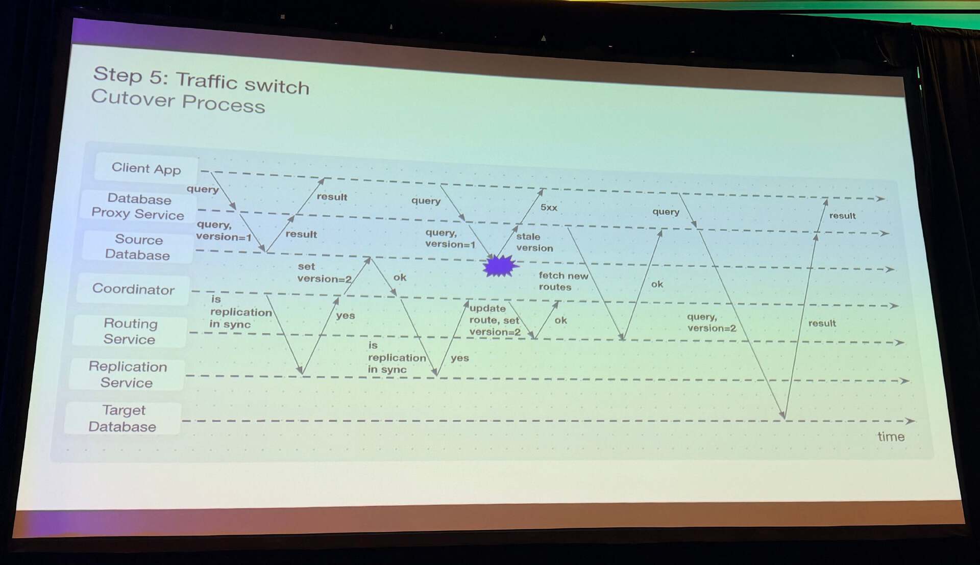该过程从客户端应用程序通过版本一的代理查询开始,该代理路由到源数据库,然后,协调器设置版本二并验证复制同步。在确认后,代理会获取新路由,并开始使用版本二进行查询,将流量导向目标数据库,而源分片接收更新以保持回滚能力。整个协调过程在毫秒级到最多 2 秒内完成,使客户难以察觉中断。
